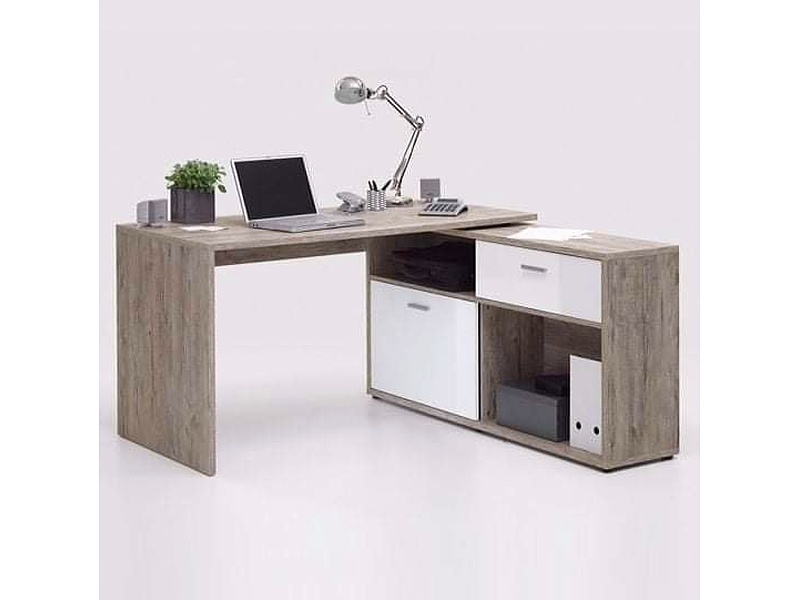 Escritorio en L con cajones y almacenamiento.