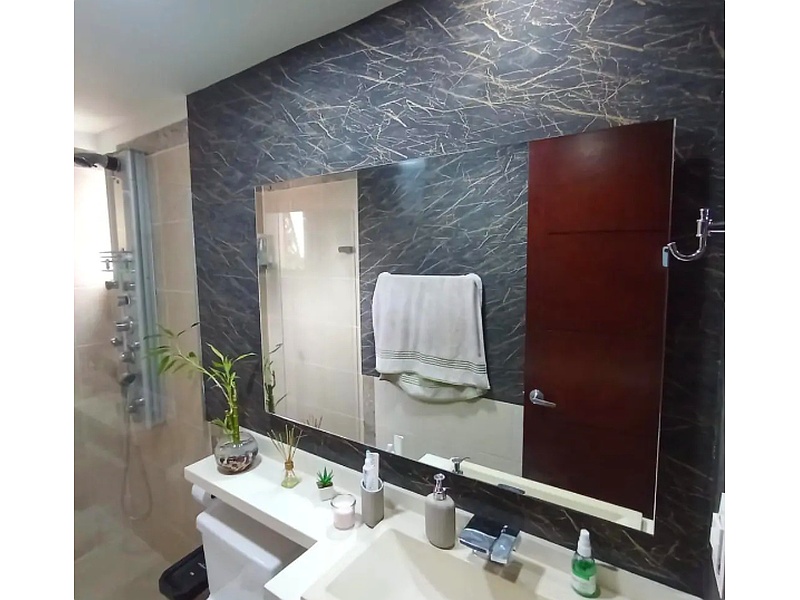 El espejo es un elemento decorativo y funcional que complementa el diseño del baño. Su forma rectangular, su tamaño considerable y su ubicación estratégica contribuyen a crear un ambiente moderno y elegante.
