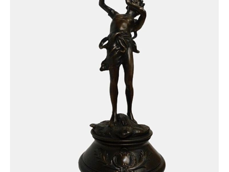 Esta magnífica escultura en antimonio, representando a un flautista, destaca por su elegante pátina de bronce envejecido. Con una altura de 50 cm y una base circular de 22 cm de diámetro, es una pieza de gran presencia que aporta un toque de sofisticación y arte clásico a cualquier espacio. Su autor, aunque desconocido, ha logrado capturar una esencia atemporal en esta obra maestra, ideal para coleccionistas y amantes del arte.