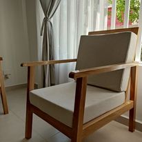 Sencillo sillón elegante, de madera y cojines color caoba.