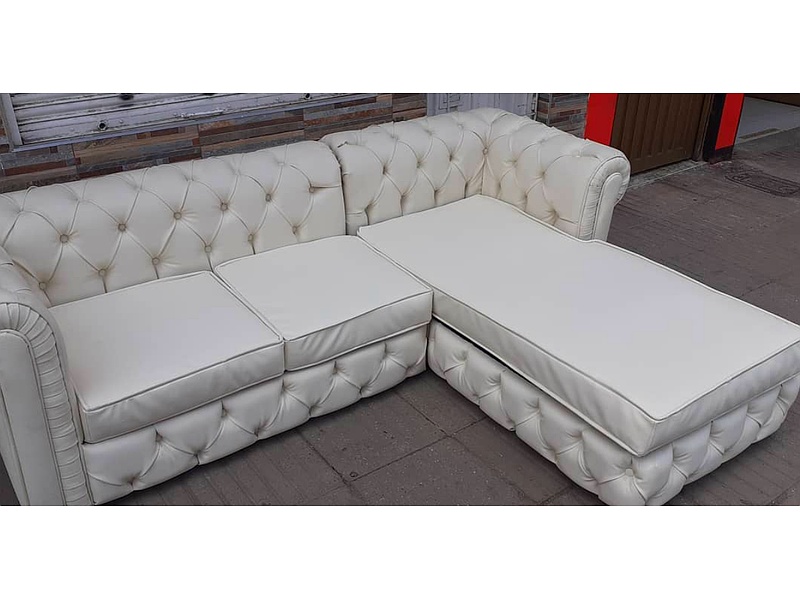 Sofá de tres plazas en forma de L, tapizado de puntos color blanco.