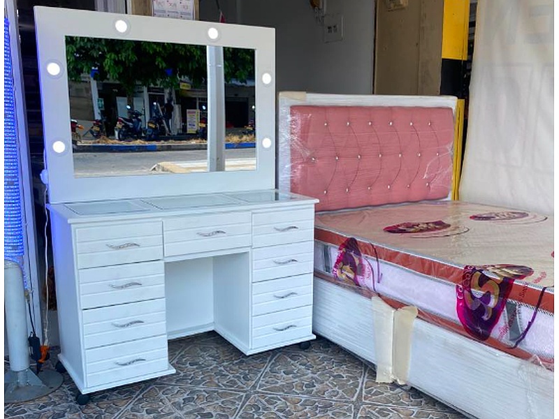 Este tocador cuenta con un espejo panorámico rodeado de luces cálidas que ofrecen una iluminación suave pero efectiva.
