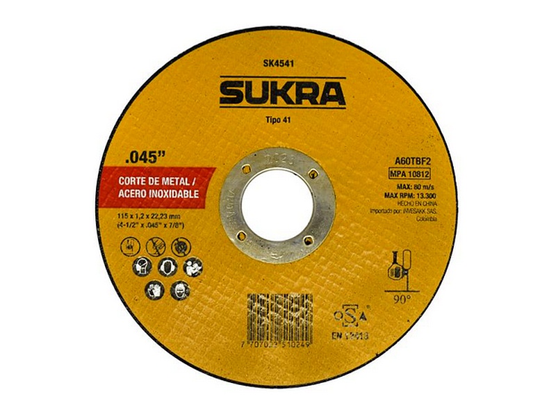 Disco Fino Sukra 4.1/2 Corte Metal/Acero Inox 4.1/2` X 0.045` X 7/8 (115mm X 1.2mm X 22.23mm).