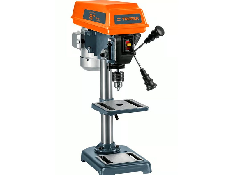 Taladro montado en un banco o soporte fijo, proporcionando estabilidad y precisión en perforaciones. Ideal para trabajos de precisión en talleres.