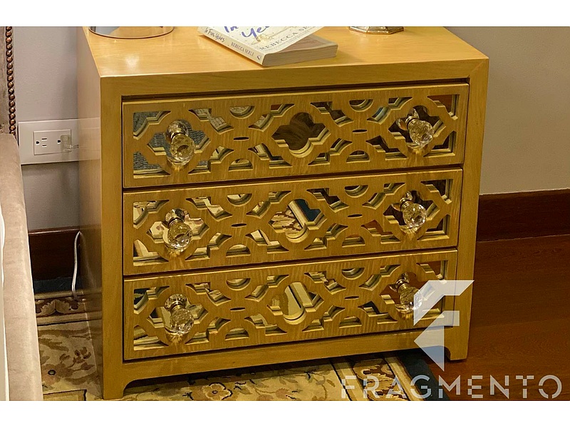 Mesita de noche color dorado con tres cajones.