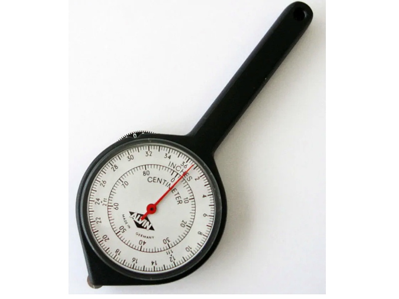 Curvímetro análogo doble cara. Unidades en pulgadas y centímetros. Medición precisa en ambos sentidos.