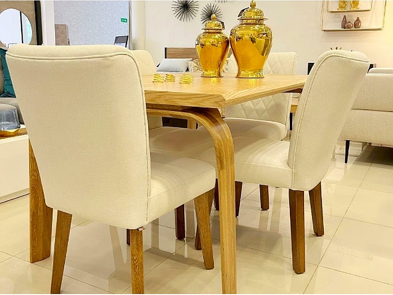 Este comedor, con una mesa de madera maciza y sillas tapizadas en lino beige, crea un ambiente cálido y acogedor. Los detalles tallados a mano en la mesa y las sillas añaden un toque de artesanía clásica, perfecto para reuniones familiares y cenas formales.