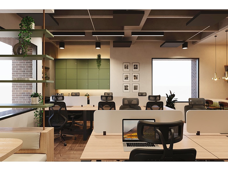 Diseño interior de oficina: muebles, acabados e iluminación.