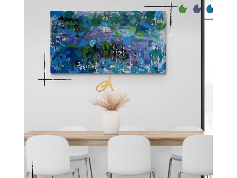 Sonia Leal, refleja la importancia del color, en esta obra abstracta siendo su dominante el azul infinito con un mediador verde que ilumina total la continuidad de los momentos. Y el tónico lavanda y gris que da una mezcla de matices perfectos y profundos. El equilibrio perfecto que define el tiempo. ¡ La obra idónea para transformar tus espacios