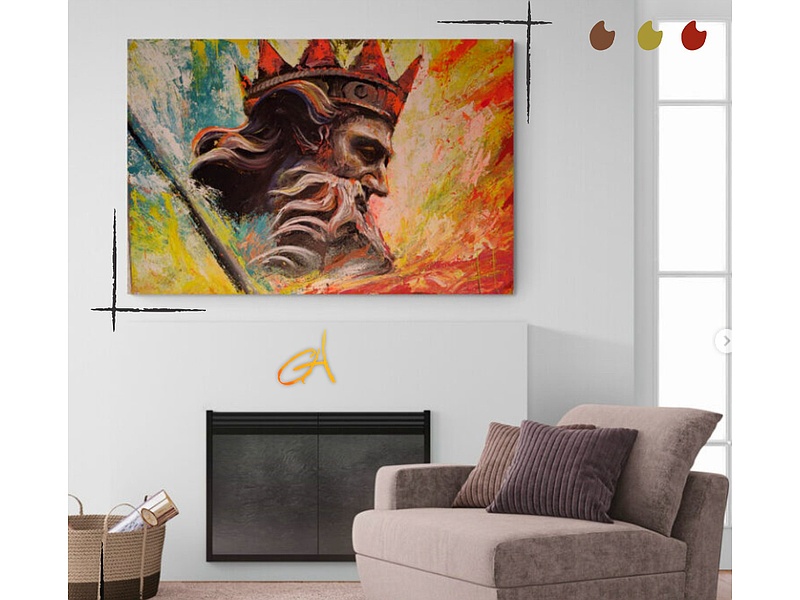 En esta obra multi matiz Camilo Leal, representa el poder y la serenidad del dios de los mares y oceános. El juego de colores y el poderío de su mirada al calmar las tormentas pero ambiguamente también el ímpetu de agitar la tierra.