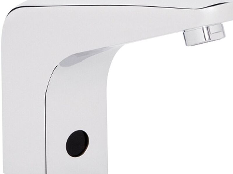 Llave de lavabo electrónica de sensor de corriente. Presión mínima recomendada 0.40kg/cm2. Consumo de agua máximo 1.5 L/min. Flujo Prisma. Acabado Cromo.