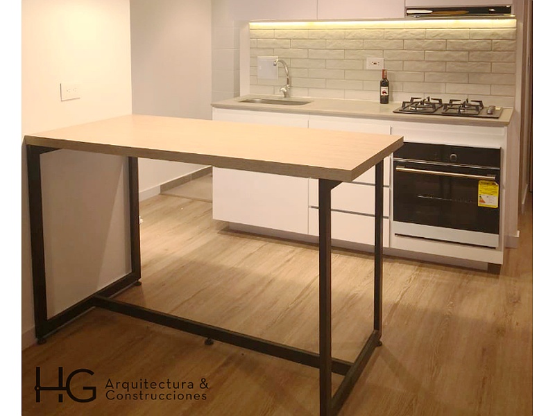 Mesa de cocina de madera y estructura metálica.