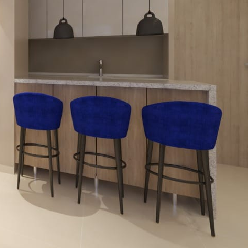 Bancos altos para bar o desayunador de color azul, banco con esqueleto de madera tapizado con tela tipo terciopelo