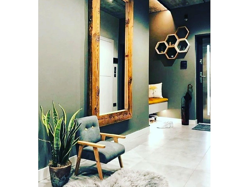 Espejo de pared rectangular con marco de madera.