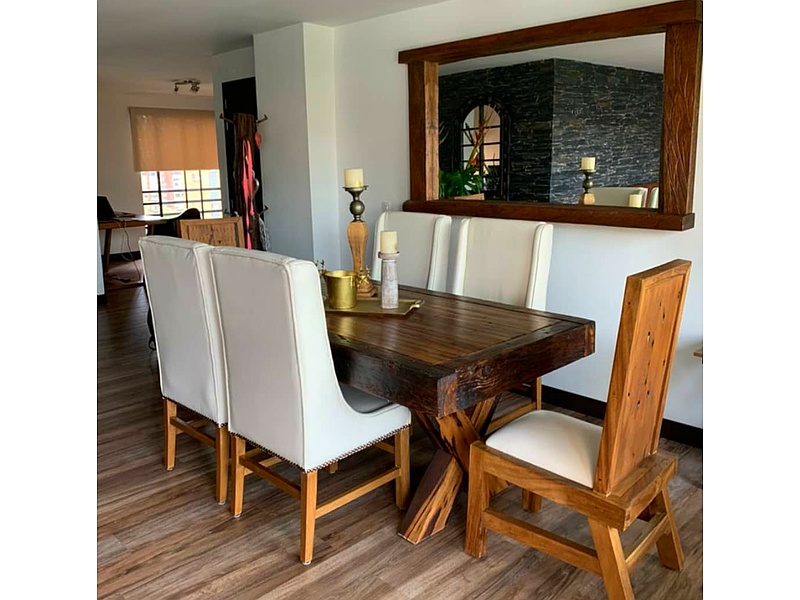 Mesa de comedor de madera rectangular con seis sillas.