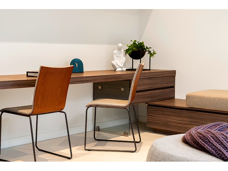 Escritorio especial entamborado, con amplios espacios de almacenamiento y puff auxiliar, ideal para trabajar en casa y mantener su espacio de trabajo en orden.