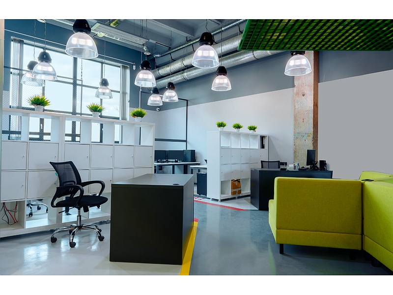 Mobiliario de oficina con un estilo industrial único: soportes negros, superficies claras, divisiones en malla y marcos en metal negro con pintura electrostática. En un ambiente industrial, con un toque de naturaleza y tonos verdes para combinar lo industrial con lo natural.