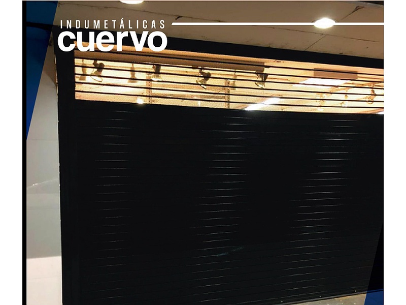 Puerta enrollable automatizada para local comercial en color negro. Cuenta con reja en la parte superior para brindar ventilación.
