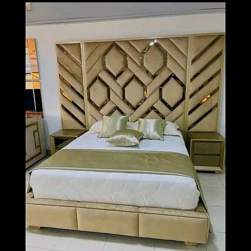Esta cama diseñada con un espaldar grande en color dorado es la pieza central perfecta para cualquier dormitorio que busque un toque de lujo y sofisticación. El espaldar, con su tapizado en diseño de rombos, no solo adorna la pared, sino que también agrega una textura elegante y un detalle decorativo distintivo que realza el ambiente. La base de la cama también en dorado, complementa el espaldar y aporta una continuidad de estilo y opulencia a la pieza.