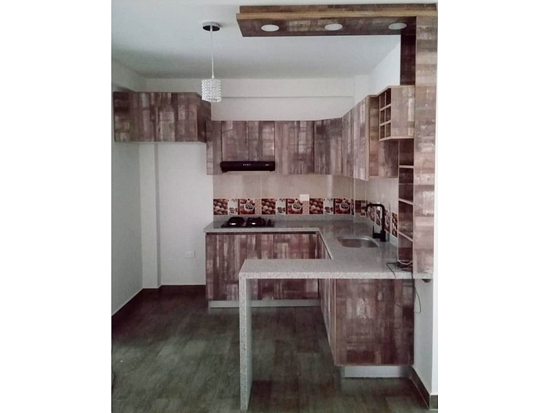 Cocina en lamina aglomerada RH ( resistente a la humedad) con mueble superior de nevera, barra, Mesón en granito y mueble para licorera .