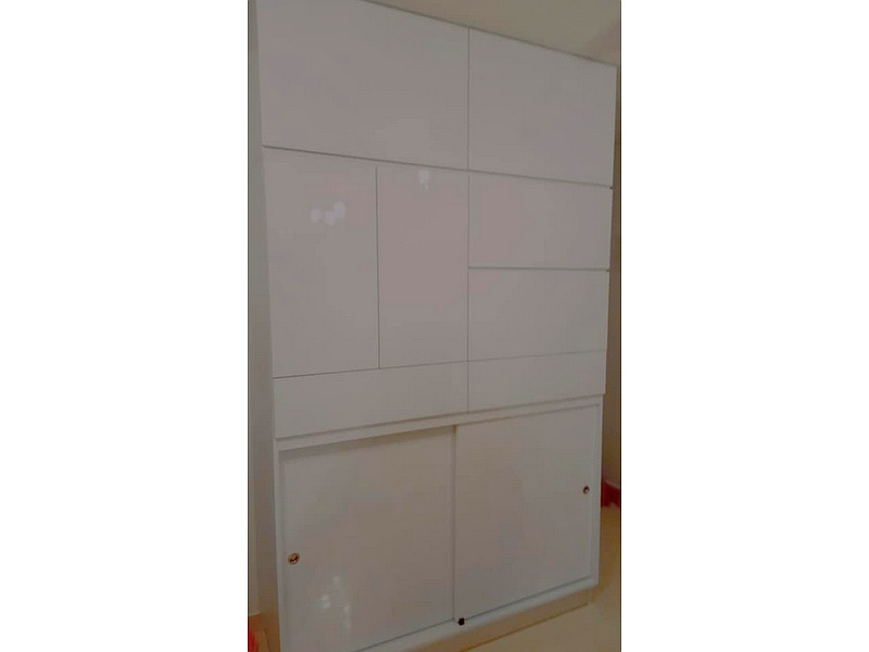 Material: interiores en aglomerado blanco Rh ( resistente a la humedad ) y puertas en aglomerado Galanti brillante de 18ml .