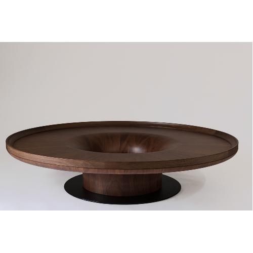 Construidas con Nogal Europeo, su cuerpo circular y parte central interior están unidos con un borde curvo que le da un efecto de continuidad infinita. Su base reposa sobre un vidrio al acido color negro.