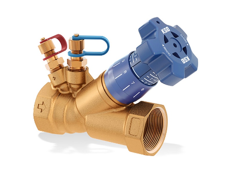 Válvula de regulación de caudal y de medición que no requiere mantenimiento con conexión roscada interna, modelo de asiento inclinado, ajustes previos variables continuos con indicador de posición legible de 360 grados. Con limitador de elevación y 2 conexiones con orificio de medición fijo (tolerancia de +/- 5 %) para medir la presión diferencial, la presión y el flujo.
