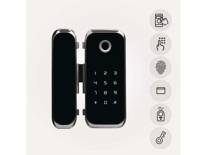 Cerradura digital biométrica especial para puerta vidriera batiente o deslizante, cuenta con bloqueo de seguridad automático que al estar cerrada la puerta se acciona bloqueando la cerradura.