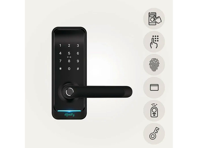 Cerradura digital biométrica compatible con puertas batientes de madera, aluminio, metal. Ideal para puertas principales y puertas de habitación. Cuenta con una mecanismo con pestillo de seguridad que se accionan por medio de una manija la cual está conectada a sus métodos de apertura.