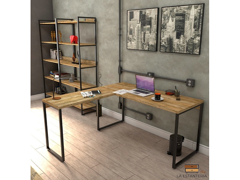 Escritorio en L para oficinas con soporte metalico.