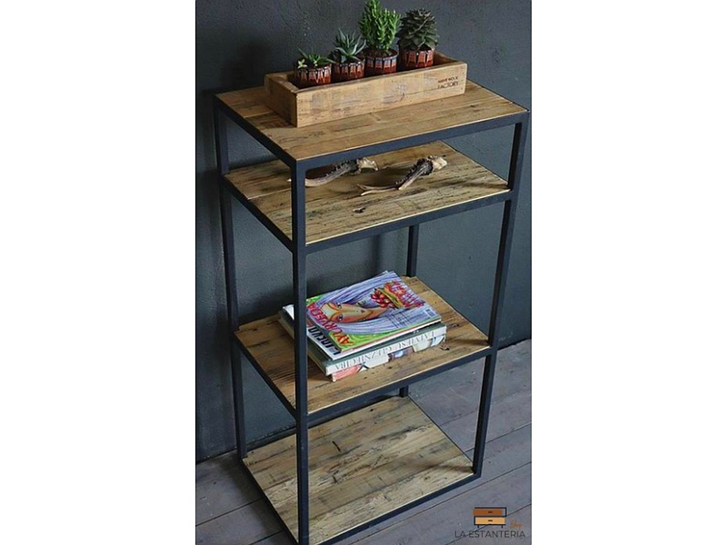 Estantería fabricada en estructura de hierro en pintura electrostática color negro con tapas de madera maciza. Medidas 70 x 50 x 30 cm
