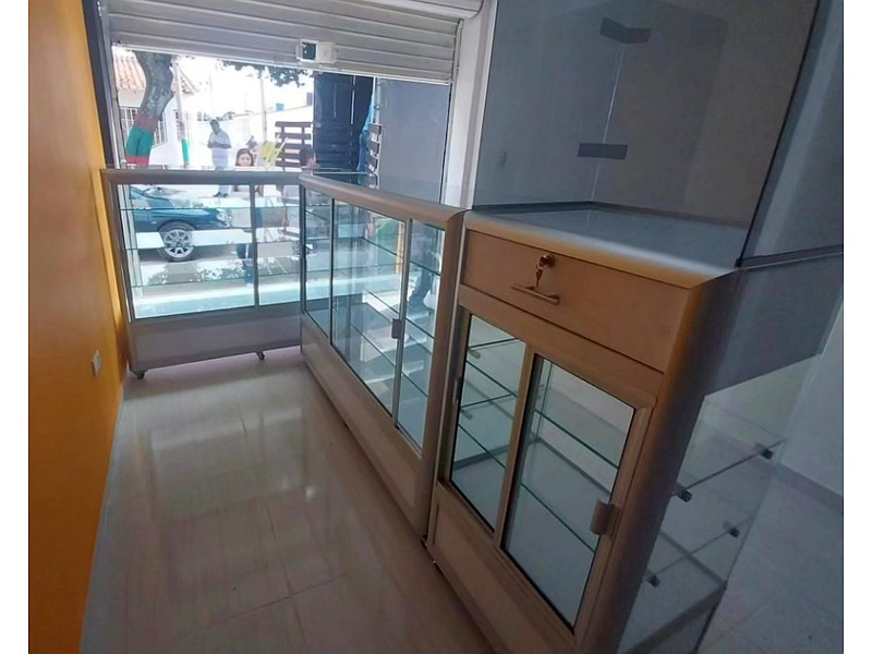 Vitrina de vidrio con aluminio, conjunto con una estación de cobro.