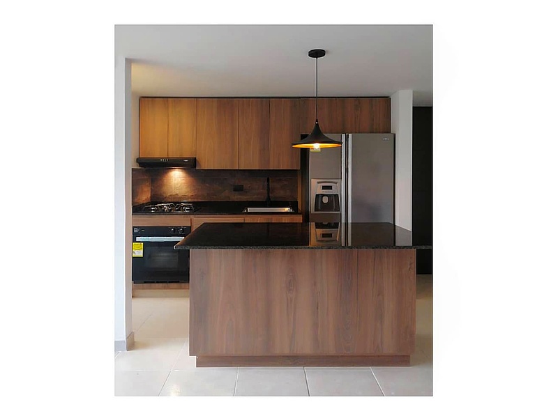 Cocina en madecor RH con grifería tipo cuello de ganzo negra + pozuelo en acero inoxidable + mesón en granito negro + Isla de almacenamiento + cubierta mixta + horno + Luminaria de techo y campana de recirculación