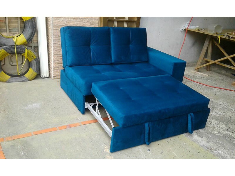 Sofá cama color azul tapizado de puntos para sala de estar.