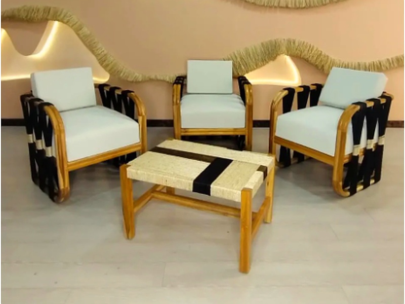 La sala de estar moderna combina comodidad y elegancia con su sofá seccional en terciopelo blanca y una mesa de centro en madera con tapiz blanco.