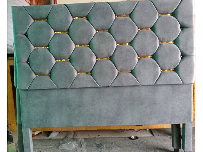 Esta cabecera destaca por su elegante diseño con piedras decorativas y un sutil toque de láminas doradas. La combinación de texturas y el brillo dorado añaden un aire de sofisticación y lujo a tu dormitorio, convirtiéndola en el punto focal perfecto para un ambiente refinado y moderno.