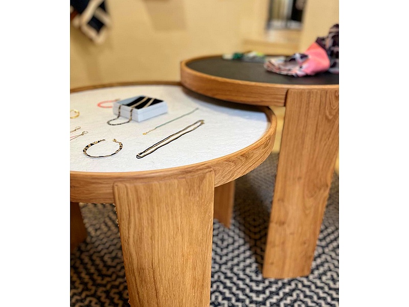Mesa de Café de Roble con Bandeja de Mica Blanca es una combinación elegante de materiales y diseño funcional. Con una estructura robusta en roble, esta mesa ofrece durabilidad y una estética natural y sofisticada.