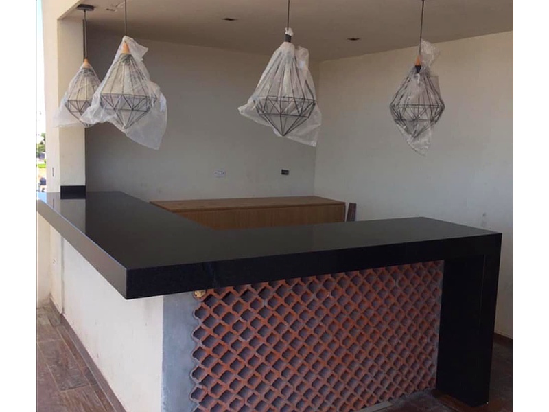 Material: El mesón está fabricado en granito, un material natural muy resistente y duradero. El granito utilizado en este caso presenta un fondo negro intenso con vetas doradas que le otorgan un aspecto elegante y sofisticado.