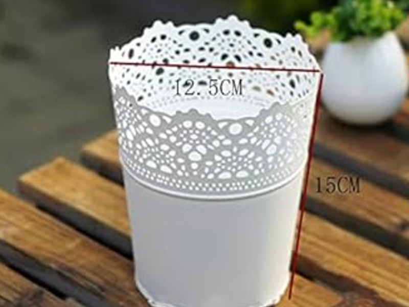 Macetas metálicas pequeñas con patrones perforados para una estética moderna.