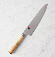 Cuchillo Chef MIYABI Birchwood SG2 20cms, hoja japonesa auténtica y delgada compuesta de acero en polvo de microcarburo G2 de primera calidad. Pulido a mano utilizando un método tradicional Honbazuke de tres pasos hasta un borde de 9,5 a 12°. Hoja CRYODUR, endurecida al hielo según Rockwell 63.