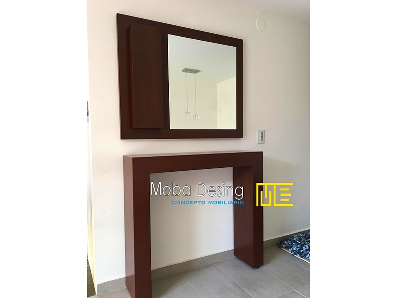 Aparador de recibidor con espejo flotante con marco.