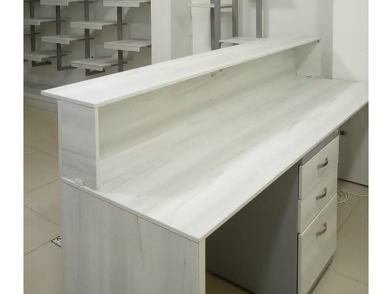 Con un diseño funcional y moderno, esta recepción laminada es ideal para espacios comerciales y oficinas. Su superficie de laminado asegura una larga durabilidad y es fácil de mantener, mientras que su estilo elegante proporciona una impresión profesional y acogedora. Perfecta para áreas de atención al cliente y recepción.