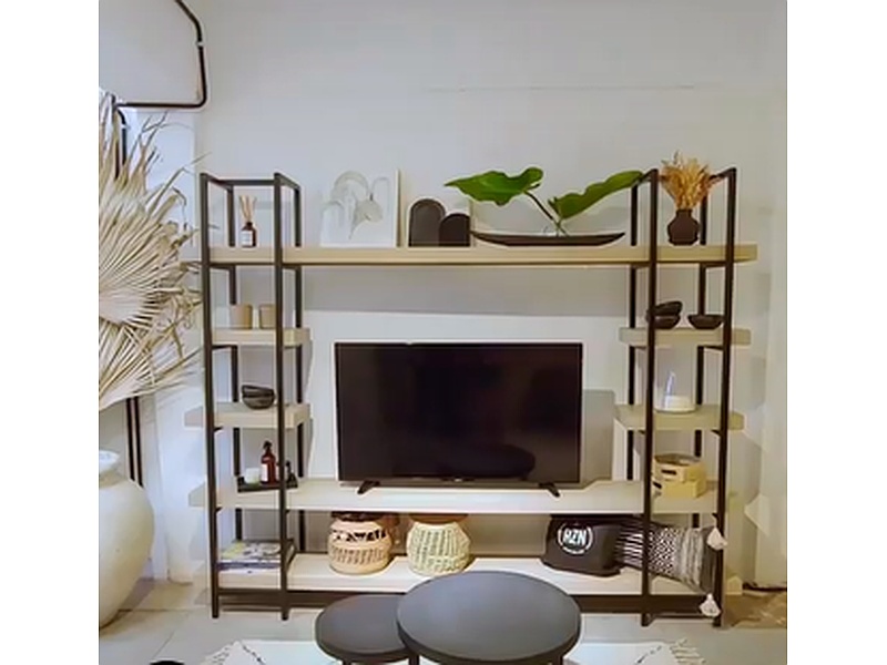 Este mueble está fabricado en hierro negro satinado y madera de paraíso, combinando robustez y elegancia. Su estructura de hierro negro proporciona un acabado moderno y duradero, mientras que los estantes desmontables enchapados en paraíso permiten personalización con colores de pátina a elección.