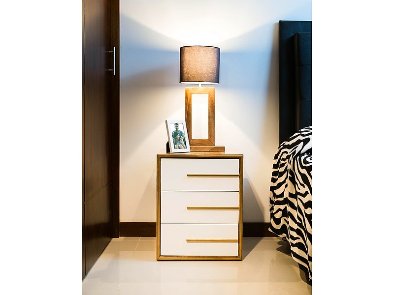Mesita de noche con tres cajones color blanco para dormitorio.