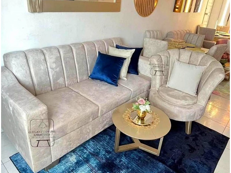 Tapizado en tela suave y resistente, con cojines mullidos que invitan al descanso. Ideal para salas de estar donde se busca el equilibrio entre funcionalidad y buen gusto.