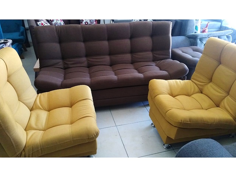 Con un sofá de 2 plazas en color marrón y dos poltronas en tono mostaza, esta sala combina calidez y modernidad en un espacio acogedor.