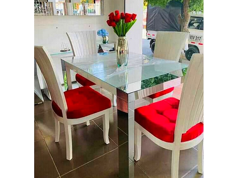 Comedor 4 puestos con sillas blancas y mesa de vidrio.