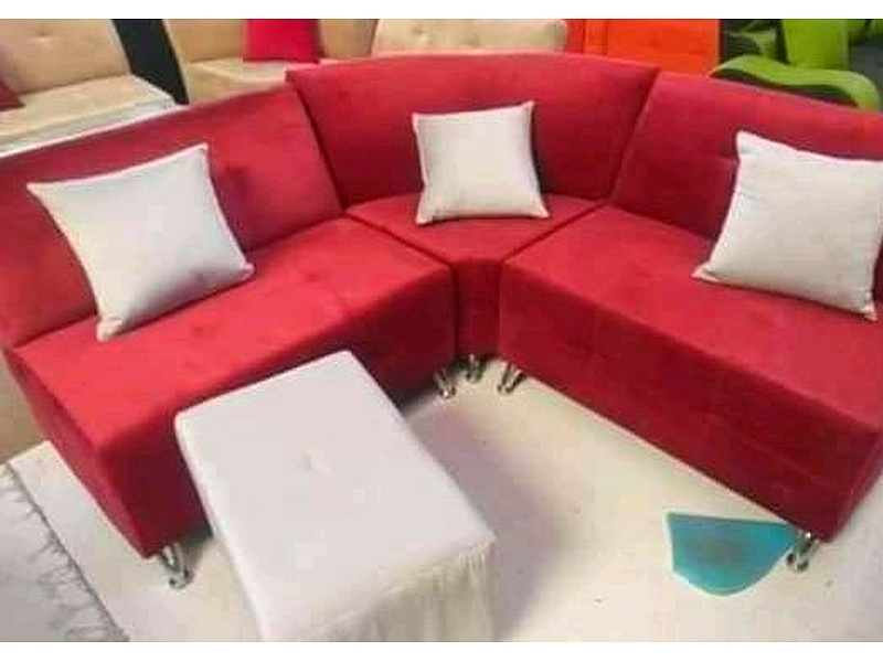 Sofá en L curvo en color rojo.