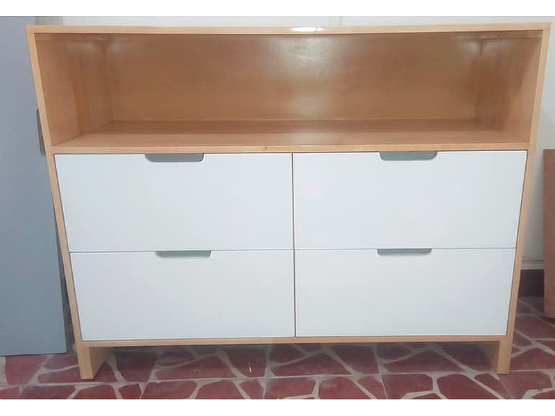 Una cómoda de cuatro cajones proporciona amplio espacio de almacenamiento en un diseño compacto. Los cajones permiten organizar ropa y otros artículos de manera ordenada. Su estilo puede variar desde moderno hasta clásico, adaptándose a diferentes decoraciones. Es una opción funcional y versátil para mantener el espacio ordenado.