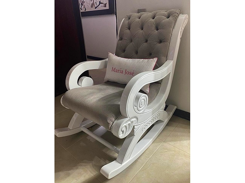 Silla mecedora capitoneada en gris y blanco, que ofrece confort y estilo.